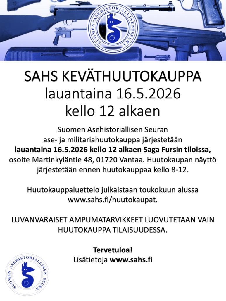 Suomen Asehistoriallisen Seuran ase- ja militariahuutokauppa järjestetään lauantaina 16.5.2026 kello 12.00 alkaen Saga Congress Centerin tiloissa, osoite Martinkyläntie 48, 01720 Vantaa (www.sagacongresscenter.fi). Huutokaupan näyttö järjestetään ennen huutokauppaa kello 8.00-12.00.