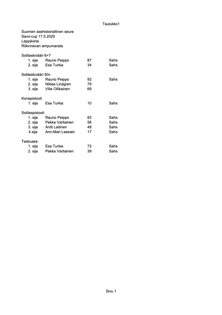 SAHS CUP-muotoisen historiallisten aseiden Savo-Cup ampumakilpailun tulokset 17.5.2025 Leppävirralla